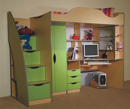 Детская мебель «Маугли 1». Цена Комплекс детской мебели разработан для детей от 3 лет. Универсальная и очень удобная детская мебель, совмещающая в себе все самое необходимое для ребенка: спальное место, шкаф для одежды, письменный стол, полки для личных вещей позволяют рационально использовать пространство небольших квартир. Габариты (ШхГхВ): 2420х970х1850 мм. Комплектация: Спальное место 1900х900 мм на втором ярусе. Письменный стол с выдвижной доской для клавиатуры. Шкаф для одежды. Книжные полки. Выдвижные ящики для канцелярских принадлежностей и игрушек. Материалы: Фасад - МДФ в пленке ПВХ. Цвет - салатовый, синий. Корпус - ЛДСП. Цвет - персик желтый. Кромка ПВХ. Цвет - серый.