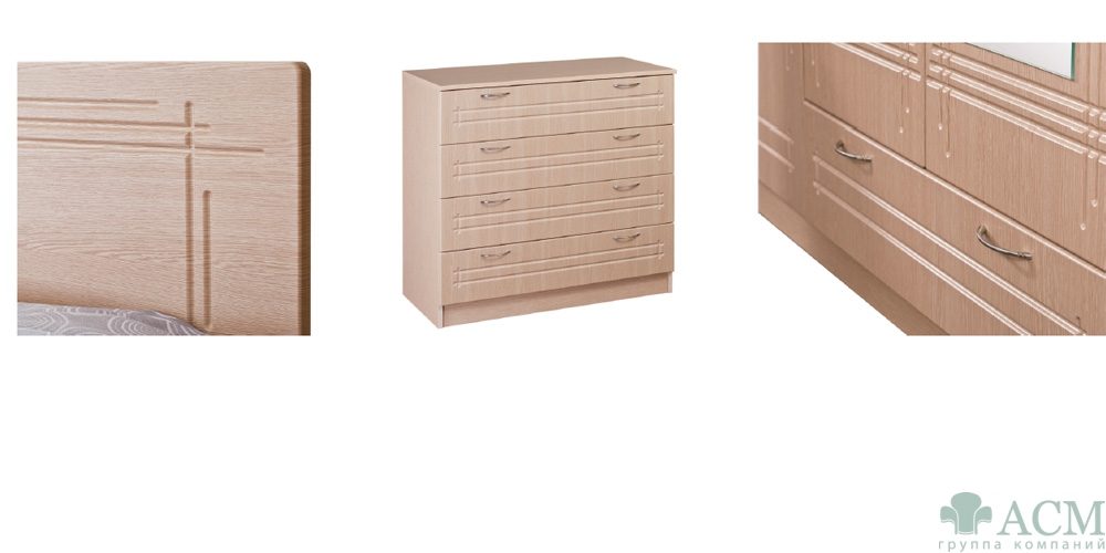 Материалы Изголовье кровати и фасады — фрезерованное МДФ в пленке ПВХ. Корпус — ЛДСтП, кромка ПВХ.
