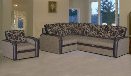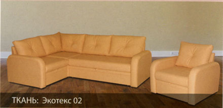 Возможность использования как центральный объект интерьера при условии заказа задников из обивочной ткани. При трансформации диван находится вплотную к стене, раскладка производиться в переднем направлении. Универсальность модульных элементов, диван может быть левым или правым. Ровное спальное место. Матрац из высокоэластичного ППУ. Бельевой ящик в кресле-приставке. Диван может комплектоваться креслом. Габариты дивана (ШхГхВ), мм: 2330×1700×850. Спальное место, мм: 2050×1430. Кресло, мм: 990×920×850.