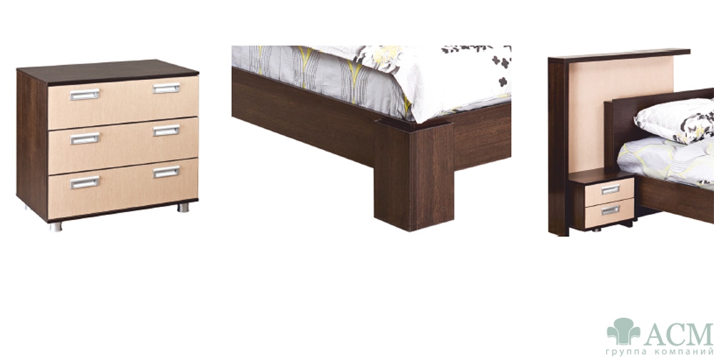 Материалы: Корпус и фасады — ЛДСтП, кромка ПВХ. Габаритные размеры кровати с двумя тумбами, мм: 2590×2200×1250