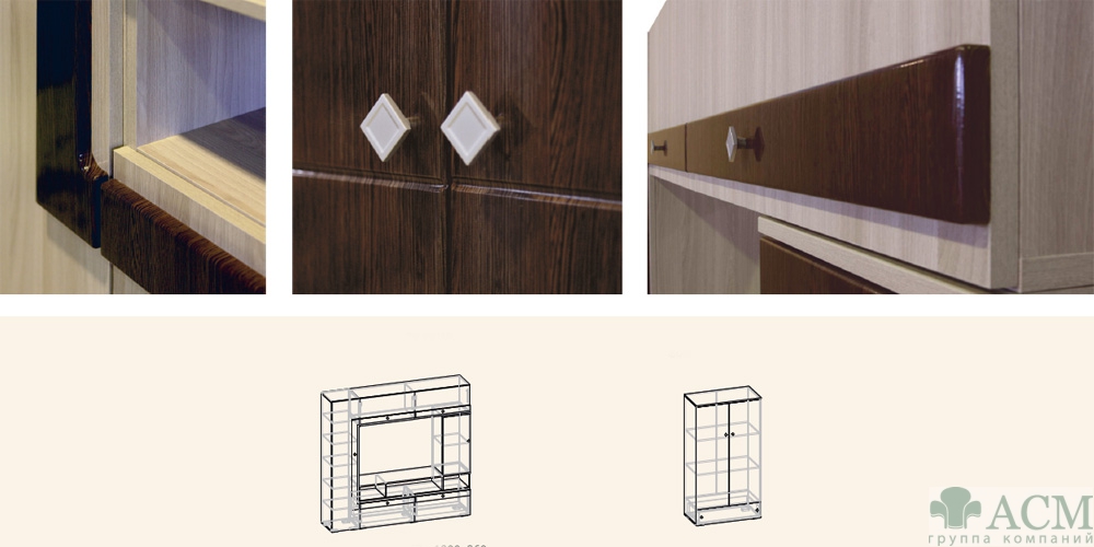 Материалы: Фасады - ЛДСтП, кромка ПВХ, комбинированнные с фрезерованным МДФ в пленке ПВХ. Корпус - ЛДСтП, кромка ПВХ.
