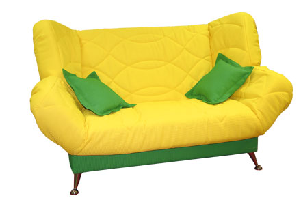 Компактный, легкий, стильный диван. Разнообразные расцветки данной модели позволяют украсить ею любой интерьер. Ровное спальное место. Съемный чехол спального места. Основание дивана состоит из металлических рам с латами, матрас состоит из высокоэластичного листового ППУ. Спинка при помощи трехпозиционного замка может принимать три положения: первые два предназначены для дневного отдыха, а последнее - для сна. Подлокотники конструкции основной рамы могут принимать четыре положения. В коробчатом основании дивана и кресла расположена емкость для хранения постельных принадлежностей. По желанию может комплектоваться двумя декоративными подушками. Механизм раскладки: «клик-кляк».