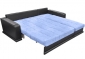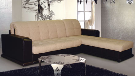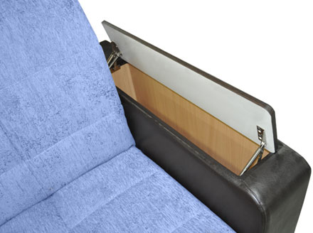 Современный стиль. Ровное спальное место. В основании дивана металлический каркас с поддерживающими деревянными латами. Матрас на эластичном ППУ. Спальное место формируется следующим образом: цокольная часть сиденья выдвигается вперед до упора, спинка, состоящая из сложенного листового пенополиуретана, раскладывается. Для удобства присутствует задняя спинка в режиме спального места. Возможность использования в качестве центрального объекта интерьера. Для трансформирования не требуется расстояние между стеной и диваном. В коробчатом основании дивана (оттоманке) расположена емкость для хранения постельных принадлежностей из ламинированного ДСП. Столешницы подлокотников открывающиеся, под ними располагаются дополнительные ниши для полезных мелочей. Угол дивана сменный. Механизм раскладки: «Аккордеон». Габариты дивана (ШхГхВ), мм: 2650×2120×880. Спальное место, мм: 2160×2000.