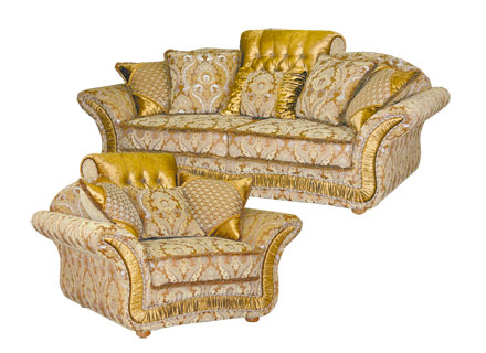 Величие и изящество присуще дизайну этого дивана, выполненного для интерьера в классическом стиле. Трехчастная форма спинки с центральной вставкой, отделанной стежкой «Капитоне» и бахромой создает эффект королевского трона. Оригинальные подлокотники с фигурной панелью, придают этой модели образ раскрытого цвтека. Удобные и мягкие приспинные подушки декорированы тесьмой и бахромой. В комплекте к дивану Вы можете заказать изящное кресло с декоративными подушками.